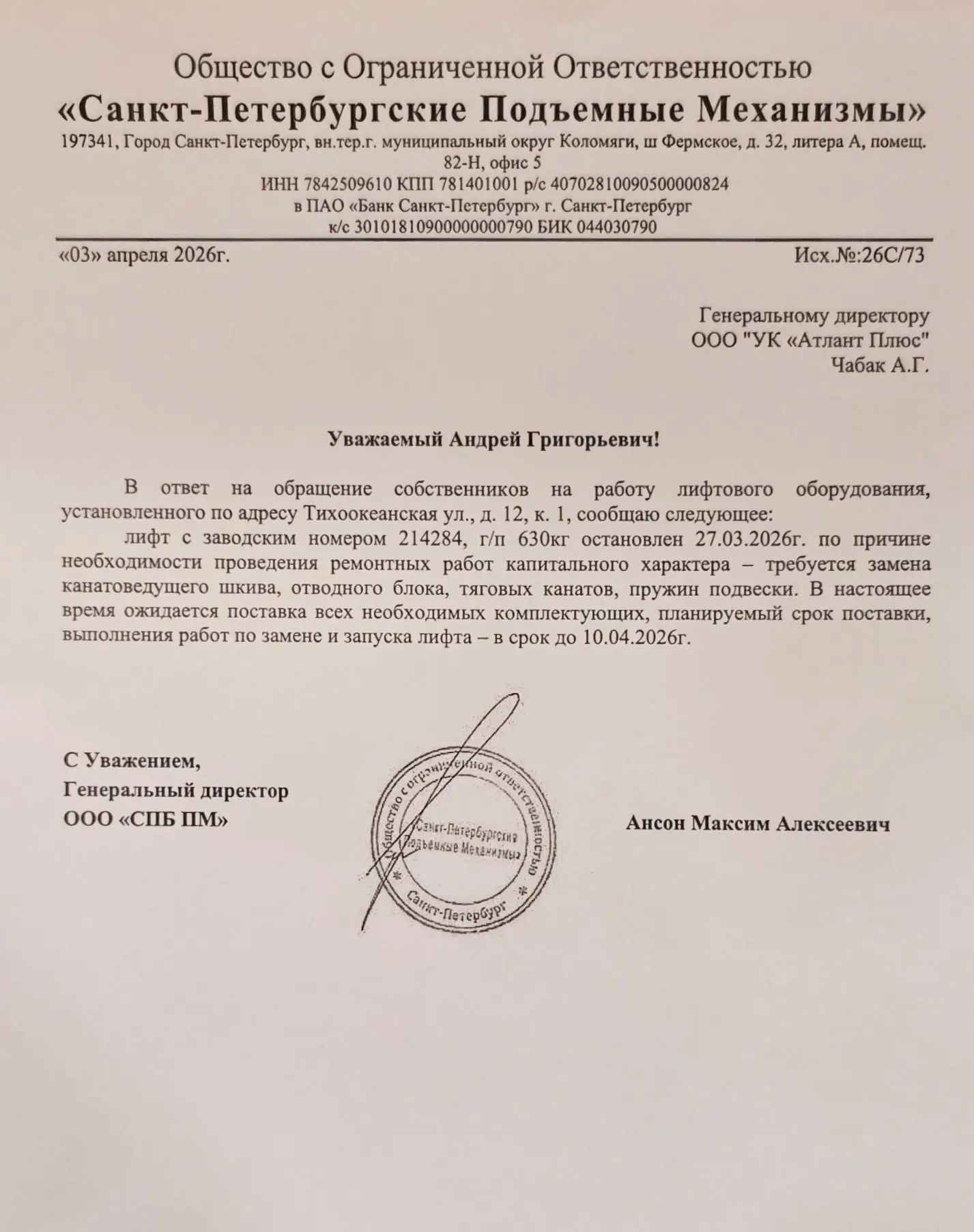 На основании обращений жильцов по некорректной работе пассажирского лифта 03.04.2026г. повторно вызван специалист обслуживающей компании ООО «СПб ПМ» по настройке электроники.